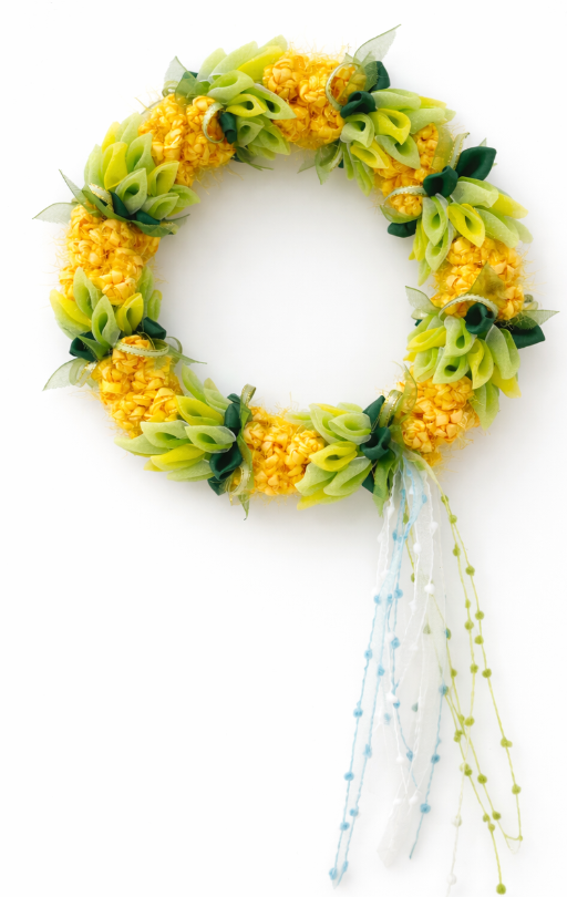 葉っぱの部分にピンキングばさみを使用しています。黄色いヤーンを編んで、ポコポコと可愛いミモザのお花をイメージしています キット代3.00円
