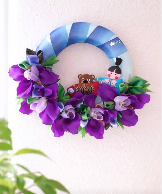幅広のグラデーションリボンでアジサイのパーツを作ってレイに入れています。